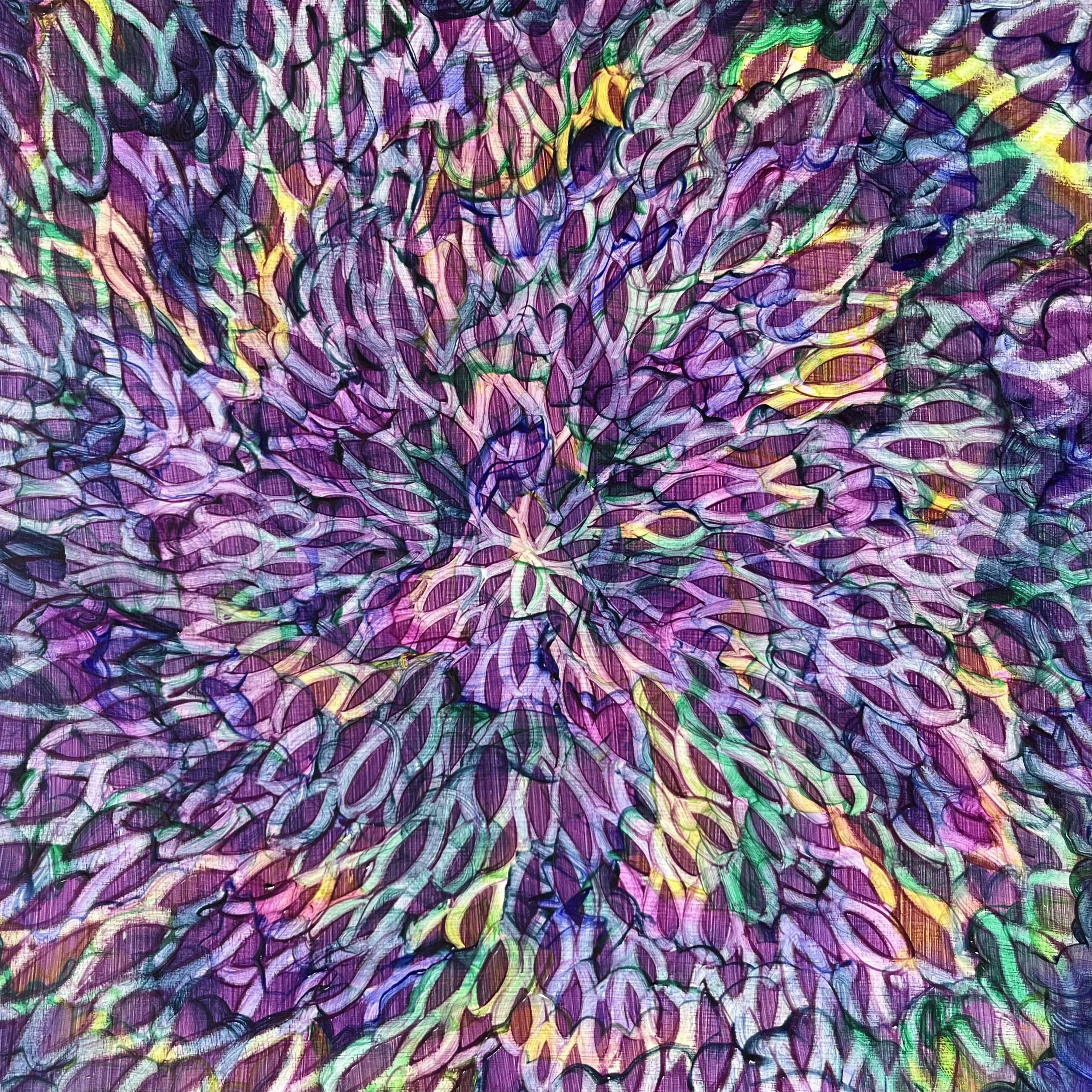 Violet Veil centres on the colour violet — the shade associated with the crown chakra (energy centre) located at the top of the head, a symbol of clarity, spirituality, and connection beyond the self. This interest aligns closely with Zhang’s broader artistic practice. Laura Zhang is an abstract artist whose work lives in the space between. Born on Hong Kong’s Lamma Island and now based in France, her repetitive, meditative painting process explores the tensions and harmonies within core dualities — among them Eastern and Western perspectives, natural and man-made structures, and internal and external landscapes.