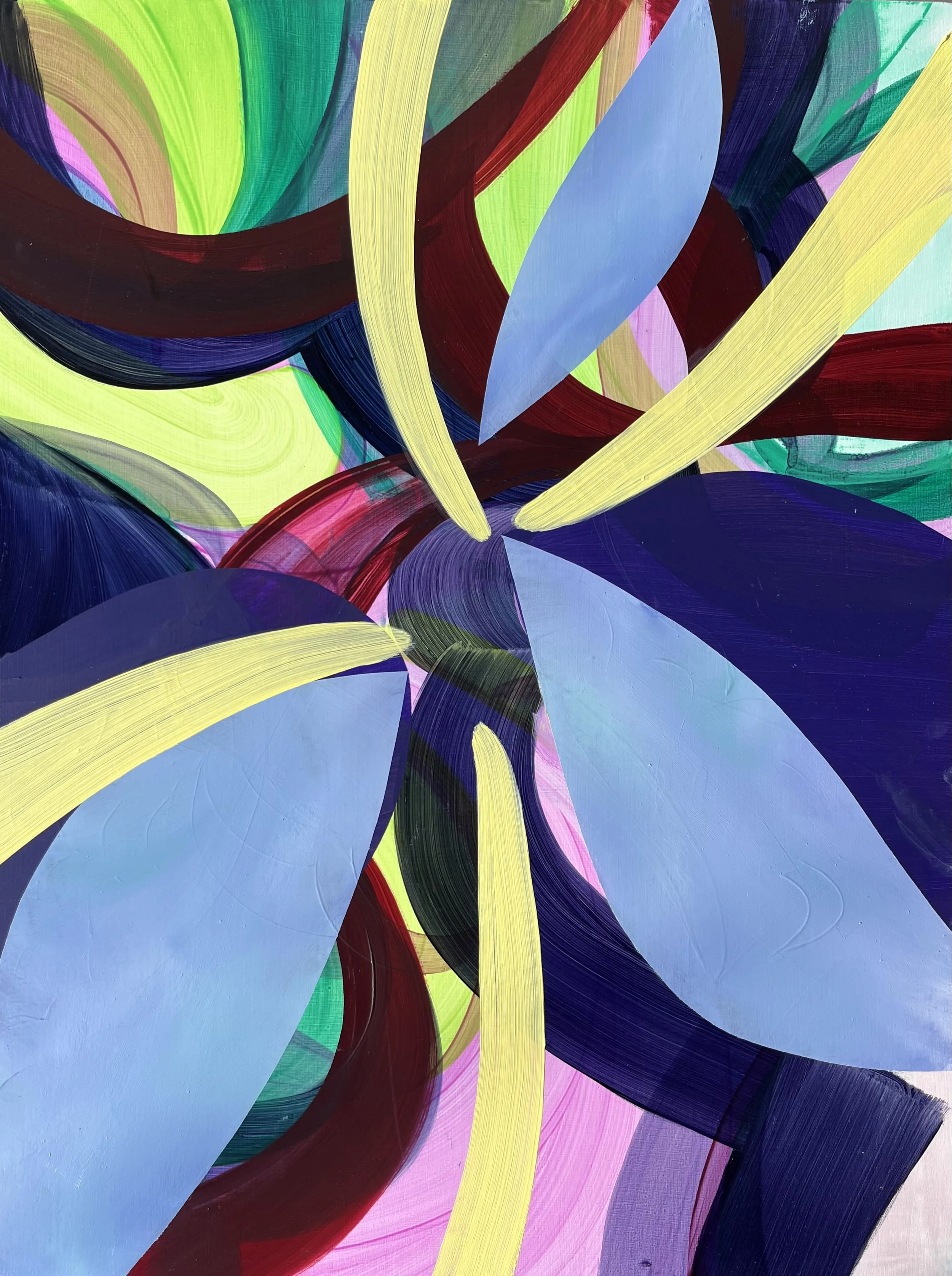 The paintings in Violet Veil unfold through intuitive, process-led methods: layered mark-making, gradual accumulation, and a willingness to let images surface on their own terms. These works extend Zhang’s evolving dialogue between the tactile and the digital. Following a recent series of major commissions for Louis Vuitton across Asia, her practice now incorporates the visual language of cutting, pasting, and imposing — gestures that echo screen-based interactions as well as the fragmented rhythms of memory and movement.
